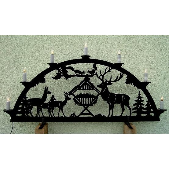 Zum Artikel: Es handelt sich bei dem Artikel um einen wetterfesten Schwibbogen bzw. einen Lichterbogen mit dem Motiv "Wildfütterung". Da es sich um einen wetterfesten Bogen handelt kann man ihn natürlich auch im Freien aufstellen.